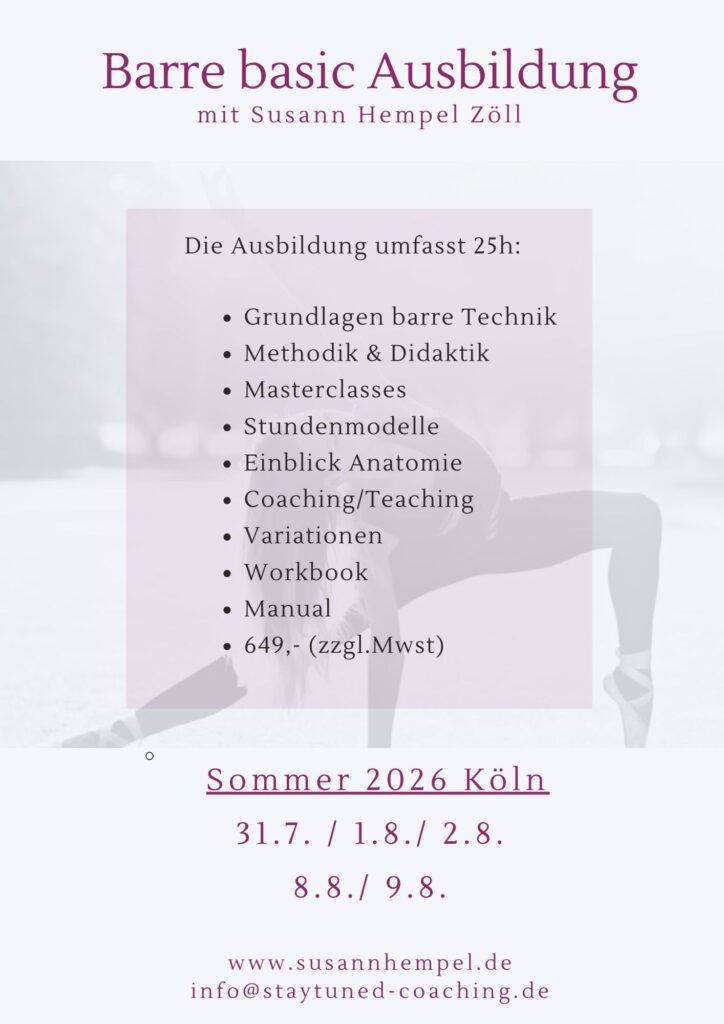 Die elegante Lösung für eine straffe und definierte Körpermitte - mit dem gewissen ästhetischen Anspruch und extrem hohem Suchtfaktor! Eine ganzheitliche Trainingsmethode die Ballett, Yoga, Pilates und funktionelles Training zu einem effektiven Workout vereint. Die Workouts orientieren sich am physisch ausbalancierten Körper einer Tänzerin, bei dem Bauch, Beine, Po und Arme abwechslungsreich definiert werden, so dass der ganze Körper an Attraktivität gewinnt und mehr Lebenskraft ausstrahlt.Spüre selbst wie sich Dein Körper elegant verändern kann. Denn in jedem von uns steckt doch eine kleine Primaballerina :) auch wenn Du noch nie in der Nähe einer Ballettstange warst! Auch Du wirst einen Kopf größer aus dem Training gehen – das ist ein Versprechen ;)! Du kannst live zum Kurs in mein Studio bzw. in den Beethoven Park kommen oder online mitmachen. Alle Termine entnimmst Du dem Kalender (s.u). Dort kannst Du Dich direkt mit einem Probetraining und zukünftig immer für Deine Lieblingskurse einbuchen. Schau ‘am besten direkt einmal rein- es gibt noch einige andere Kurse im Angebot!